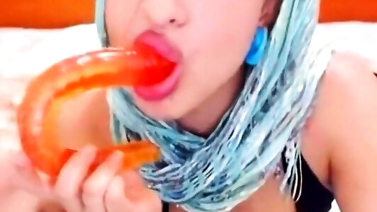 Gigantic Krystar blows a dark-hued fake penis